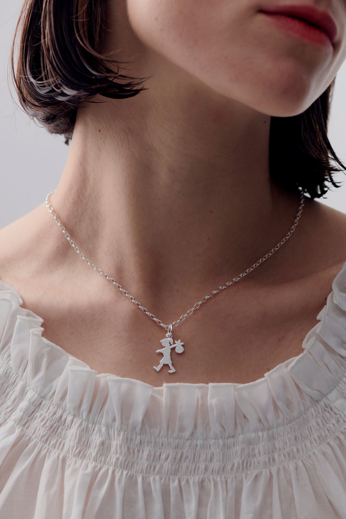Karen Walker's beloved Runaway Girl is a symbol of independence and intrepidity. Suspended from a 50cm oval belcher chain, the sterling silver Runaway Girl Pendant is the quintessential necklace for those with an adventurous spirit.